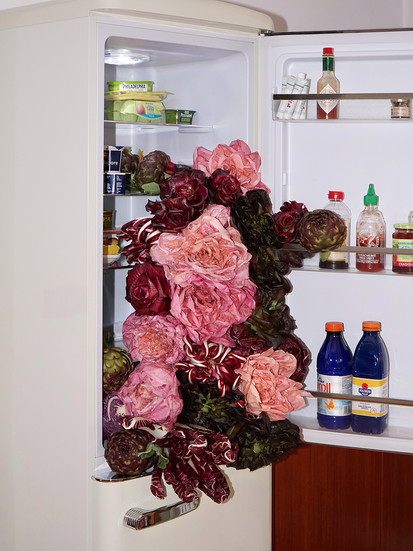 Un giro dal fruttivendolo di prima mattina, un carico di cassette: una composizione di insalate e verdure che sembra fiorire dal frigorifero, trasformandolo in un luogo di crescita e vitalità così prorompente che ne sfonda lo spazio, ne ridisegna i confini, esplode nella cucina.